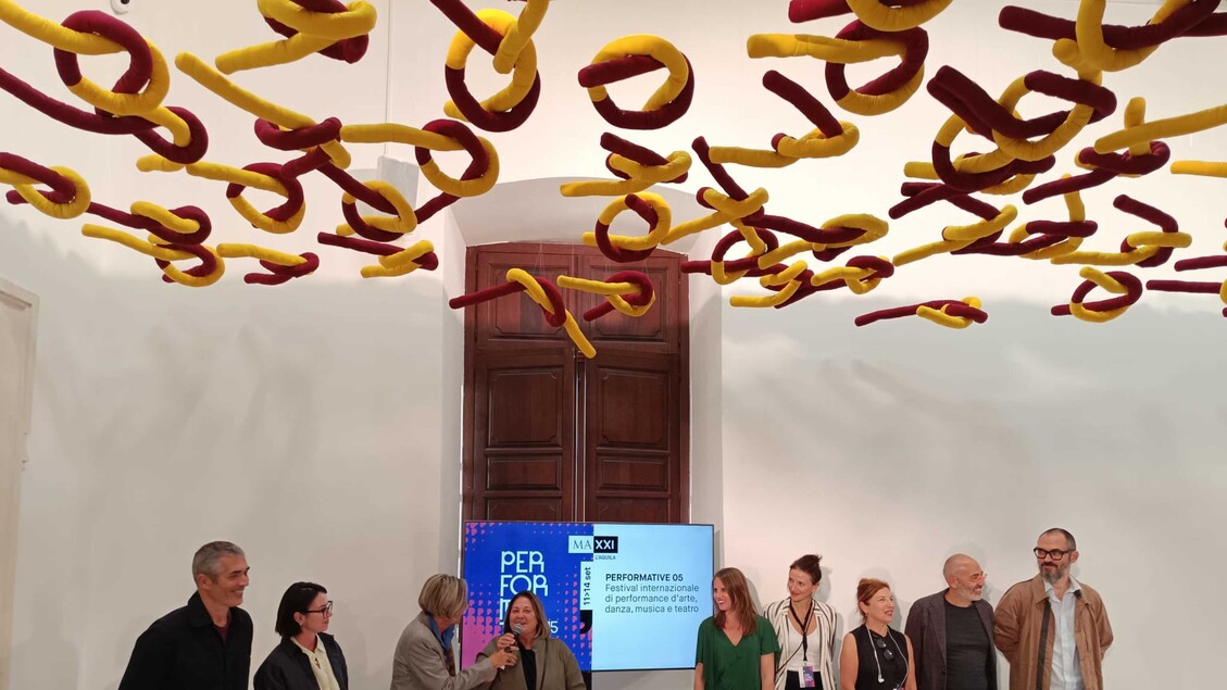 Al centro di Performative c’è il linguaggio in tutte le sue forme. I curatori — Chiara Bertini, Fanny Borel, Anne Palopoli, Donatella Saroli, Silvano Manganaro e Gianni Moretti — indagano come si esprime la comunicazione artistica, dalla voce al corpo, fino al tessuto, visto come racconto e simbolo.