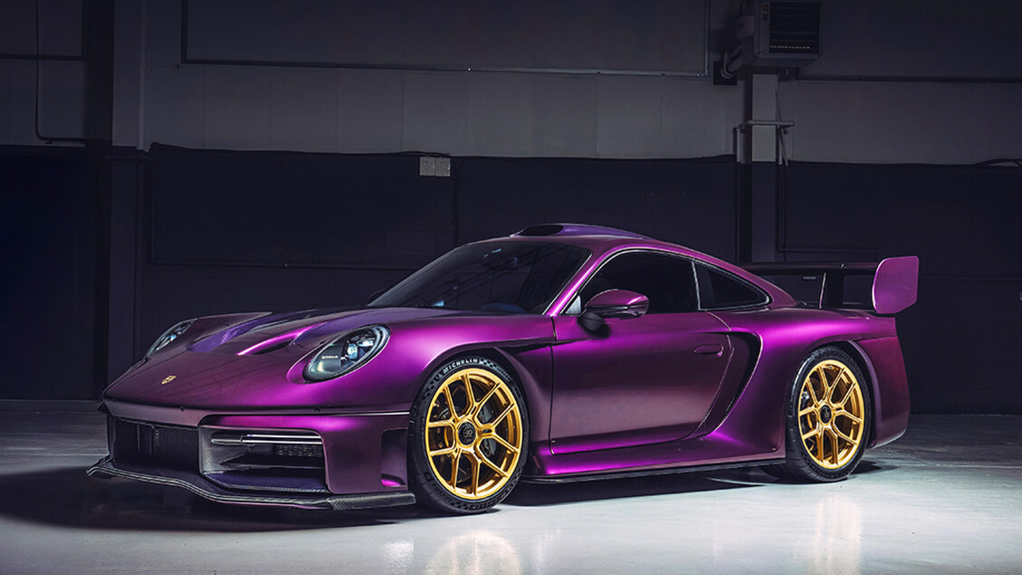 La prima GT Hypercar uscita dalla linea di produzione sfoggia una livrea Storm Purple, con tetto e cofano in fibra di carbonio a vista con finitura fumé. Il risultato è un look elegante ma con un tocco aggressivo. I cerchi, più grandi rispetto alla Porsche di partenza, montano un dado centrale e sono verniciati in oro, abbinati alle pinze freno color grigio canna di fucile. Anche badge e scritte sono realizzati a mano con dettagli dorati, a sottolineare l’esclusività della vettura.